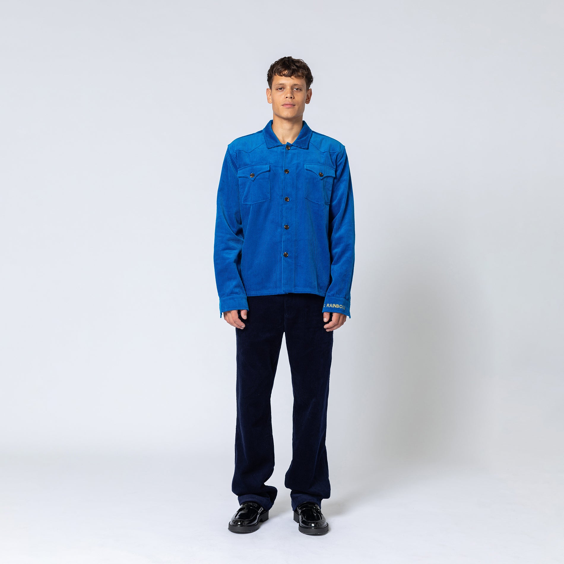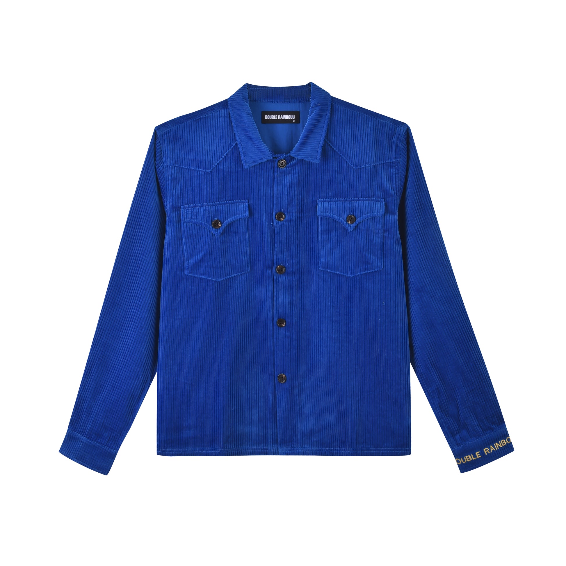 Unisex long sleeve western shirt in cobalt blue corduroy. Overshirt fit with yoke detail, front pockets, press studs and contrast yellow logo embroidery on cuff and back. Made from 100% Cotton corduroy.