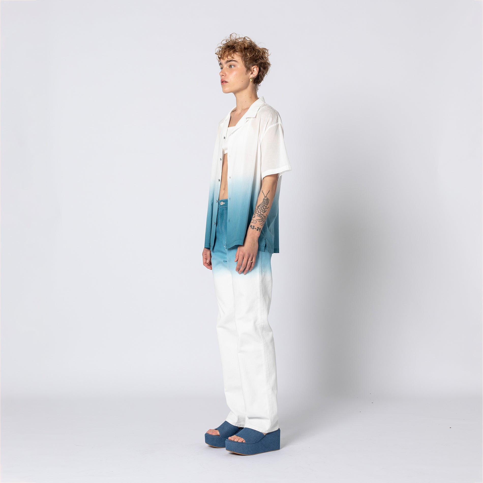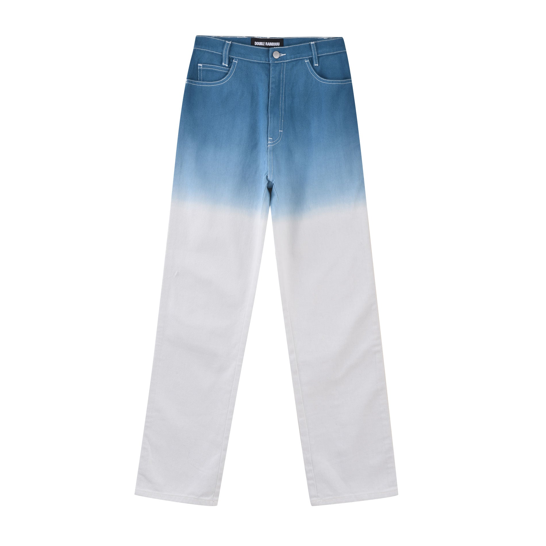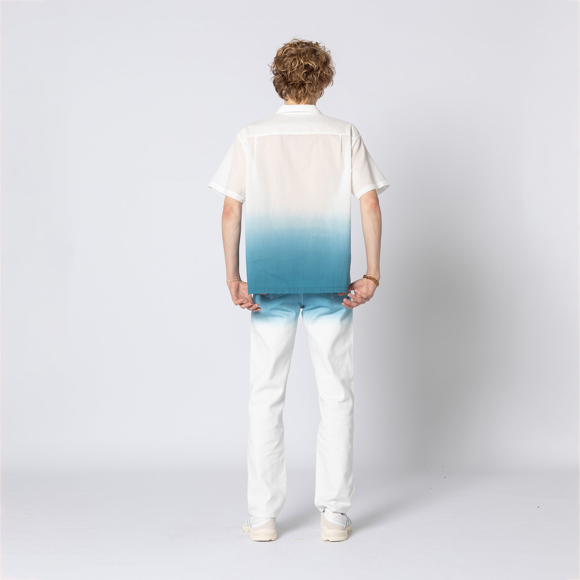Straight leg, non-stretch cotton drill jeans. High-rise five pocket jean with belt loops, zip-fly and leather logo patch. Made from 370 GSM 100% Cotton Drill in an indigo ombré dye.