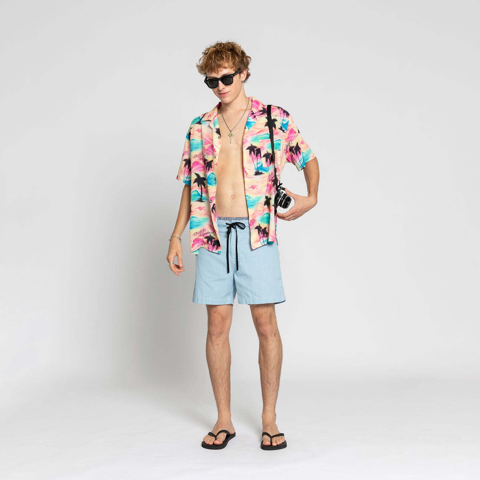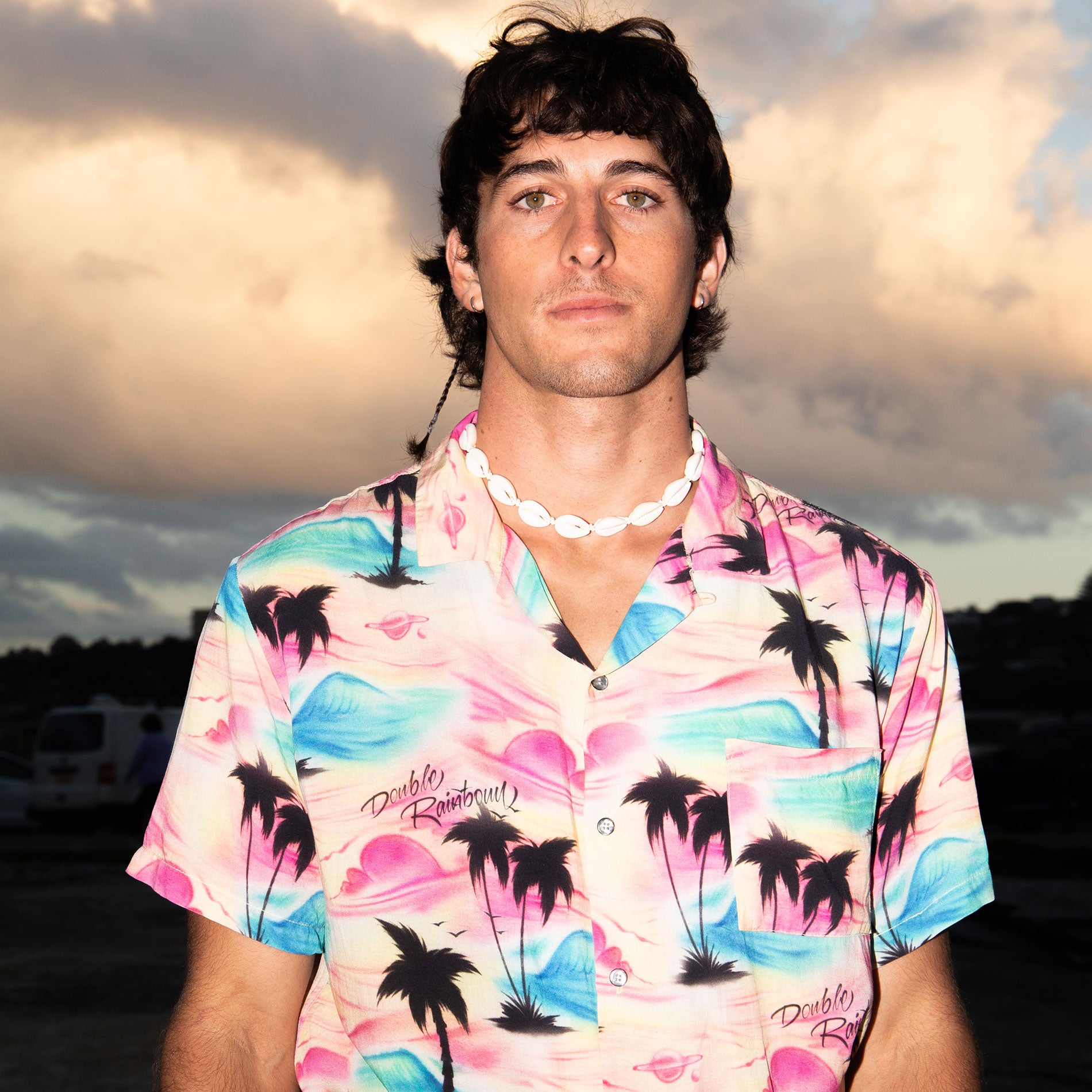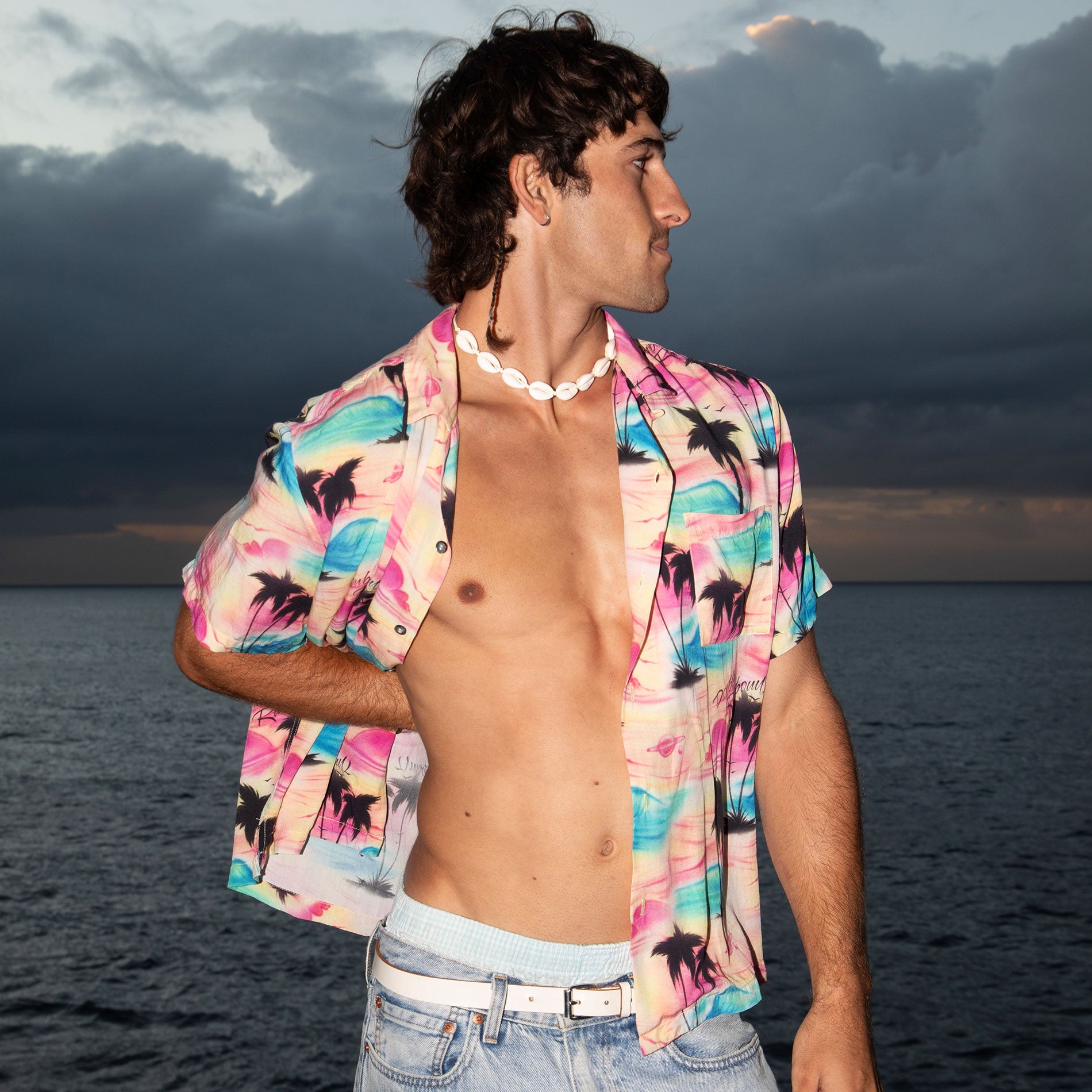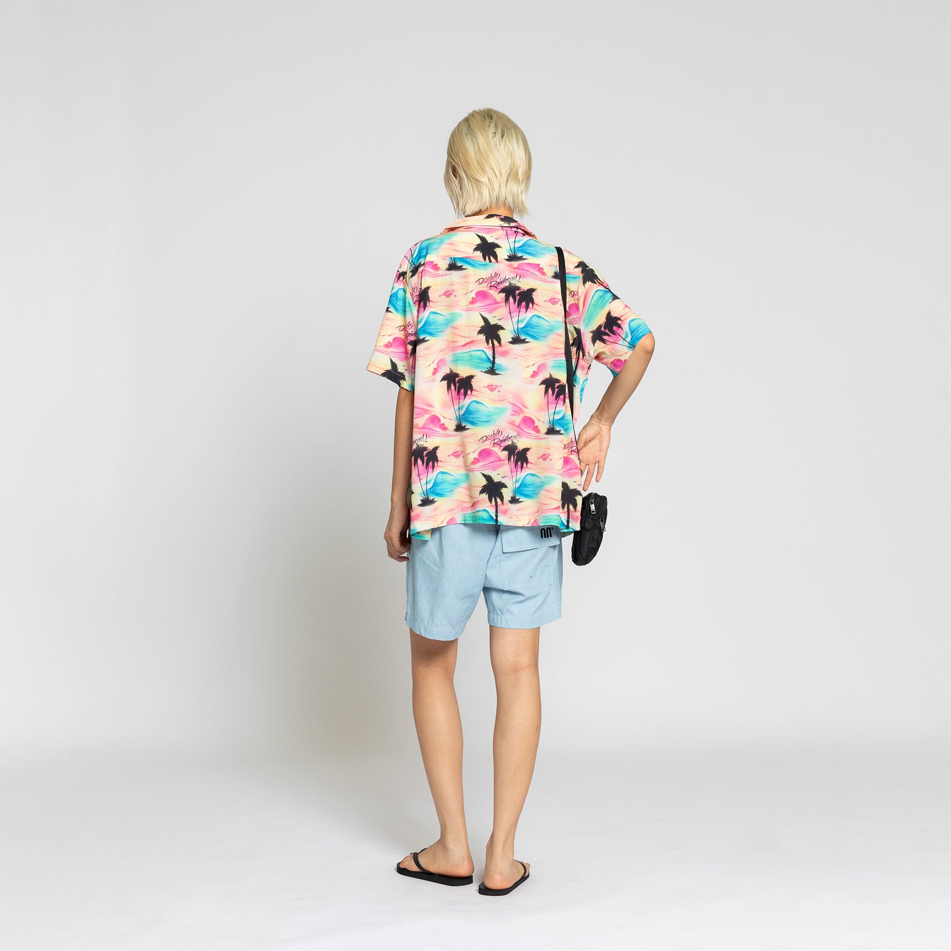 Unisex short sleeve Hawaiian shirt with boxy fit, camp collar with an original digital print. Made from 100% EcoVero™ rayon.