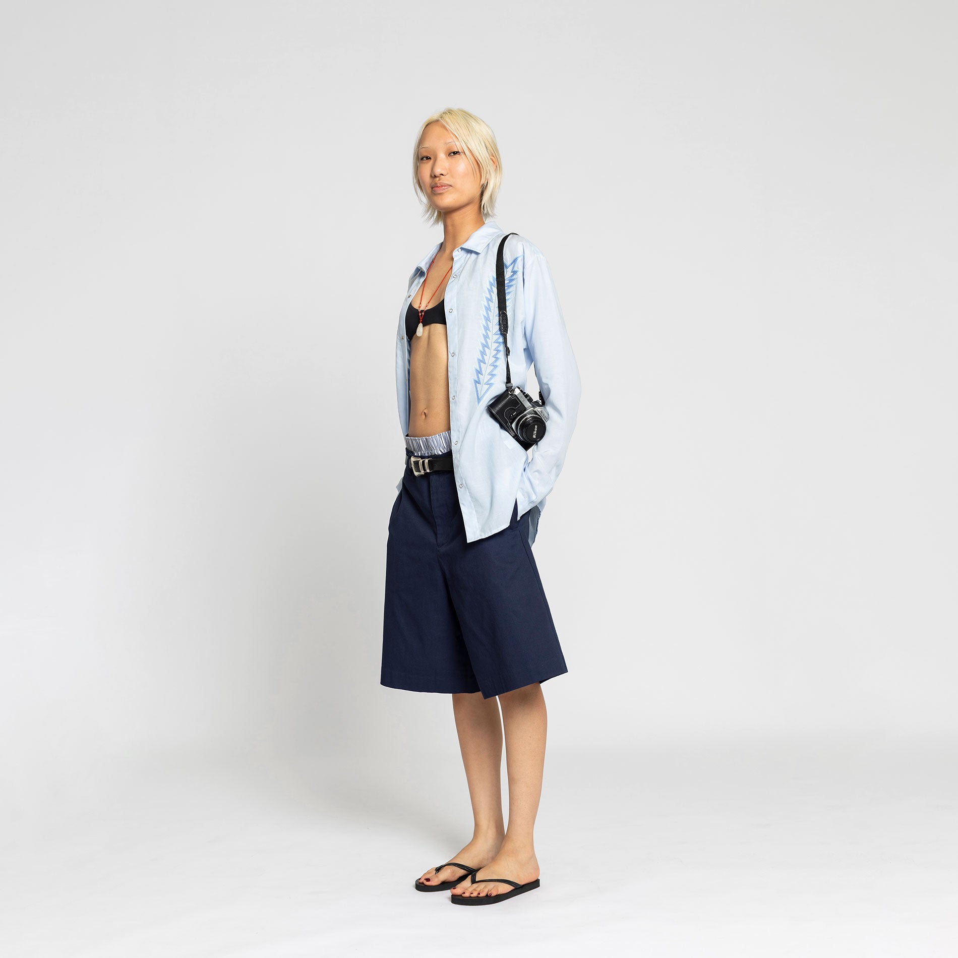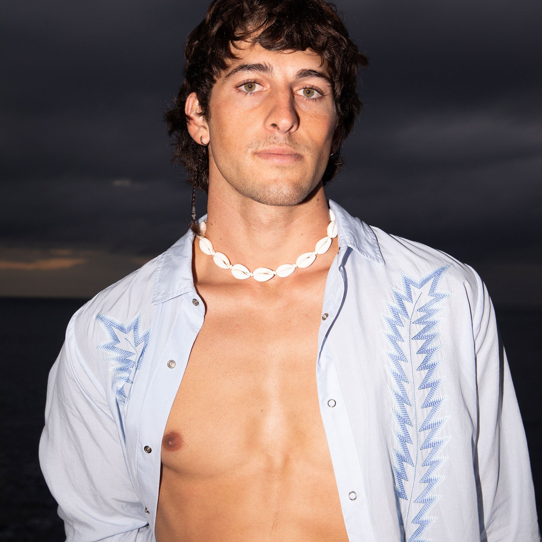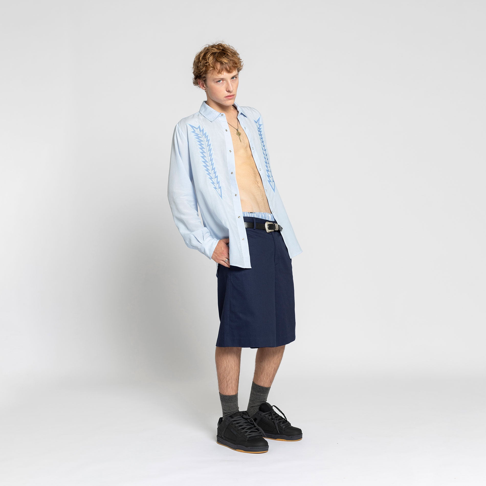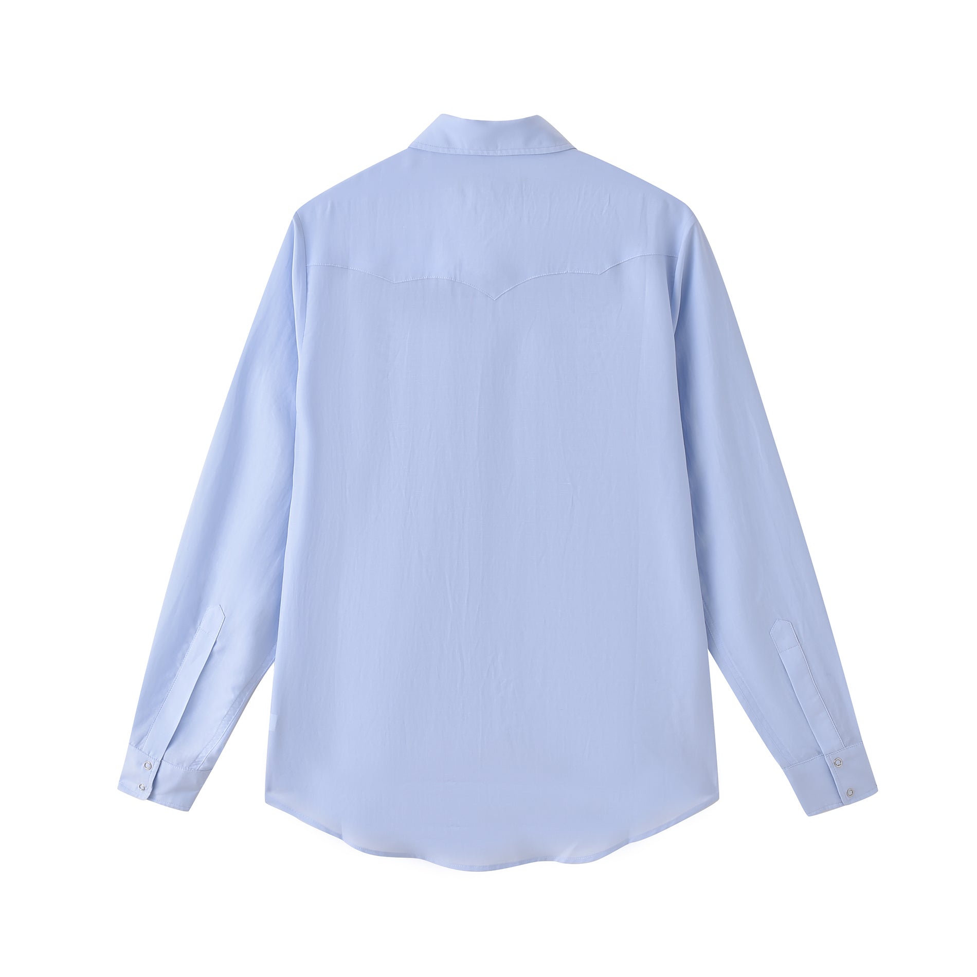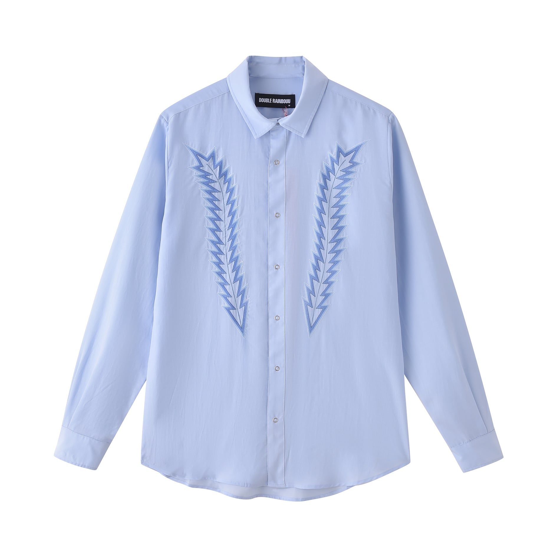 Unisex Western long sleeve shirt. Regular fit with press stud closure and signature Double Rainbouu feather detail embroidery on front. Made from 89% TENCEL™ and 11% Linen.